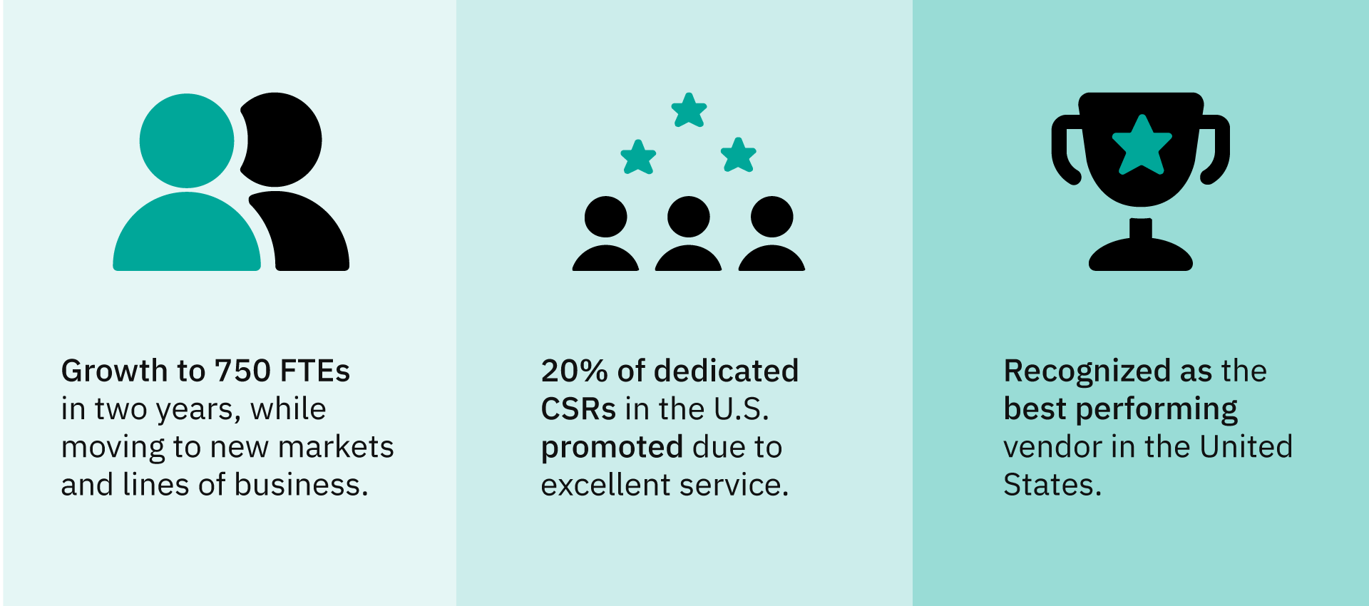 Our demonstrated flexibility and agility in Europe led to further opportunity supporting the client's US expansion. This required rapid recruitment, coaching, training, and development of customer service representatives to effectively serve their growing US customer base.