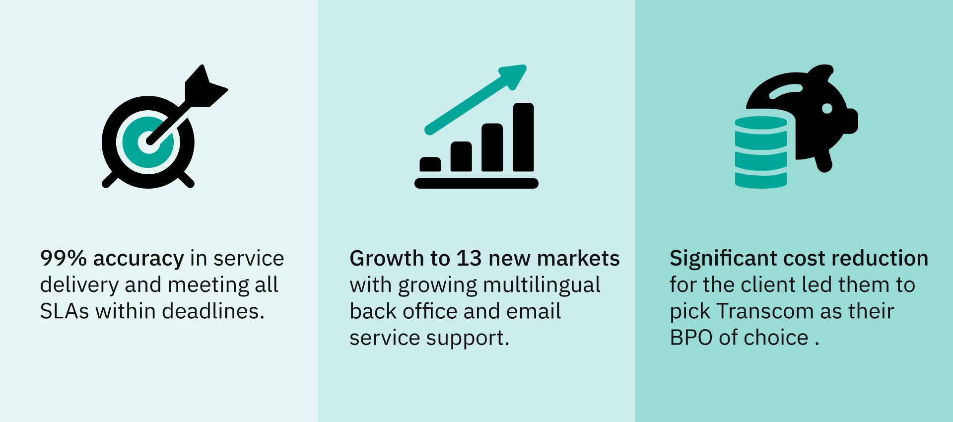 Transcom's cost-effective solutions positioned us as the primary BPO partner for our client's EMEA expansion. Our commitment to quality, evidenced by 99% service delivery accuracy and consistent SLA adherence, ensured seamless operations. Deep understanding of the client's business enabled an enhanced customer experience.